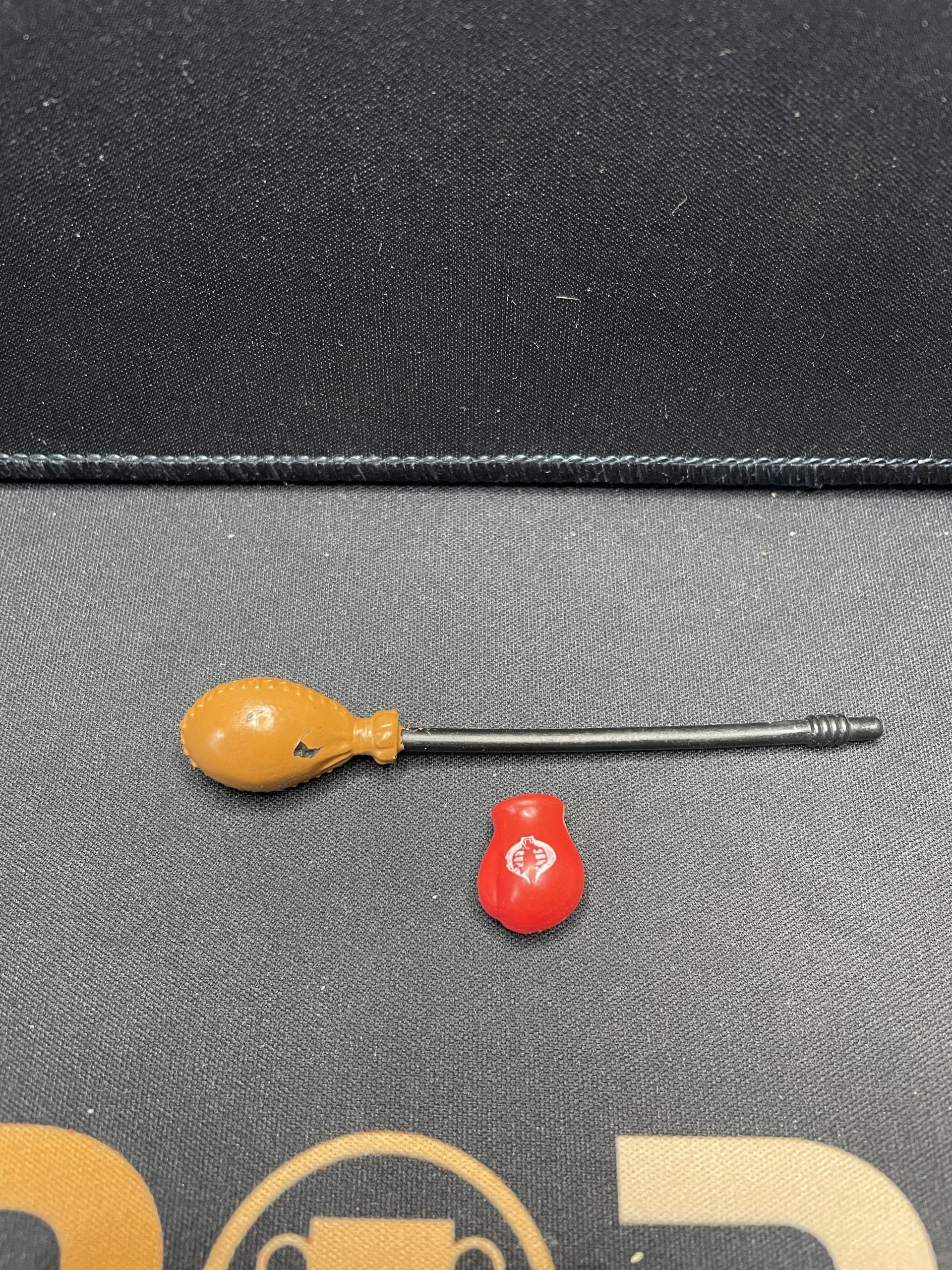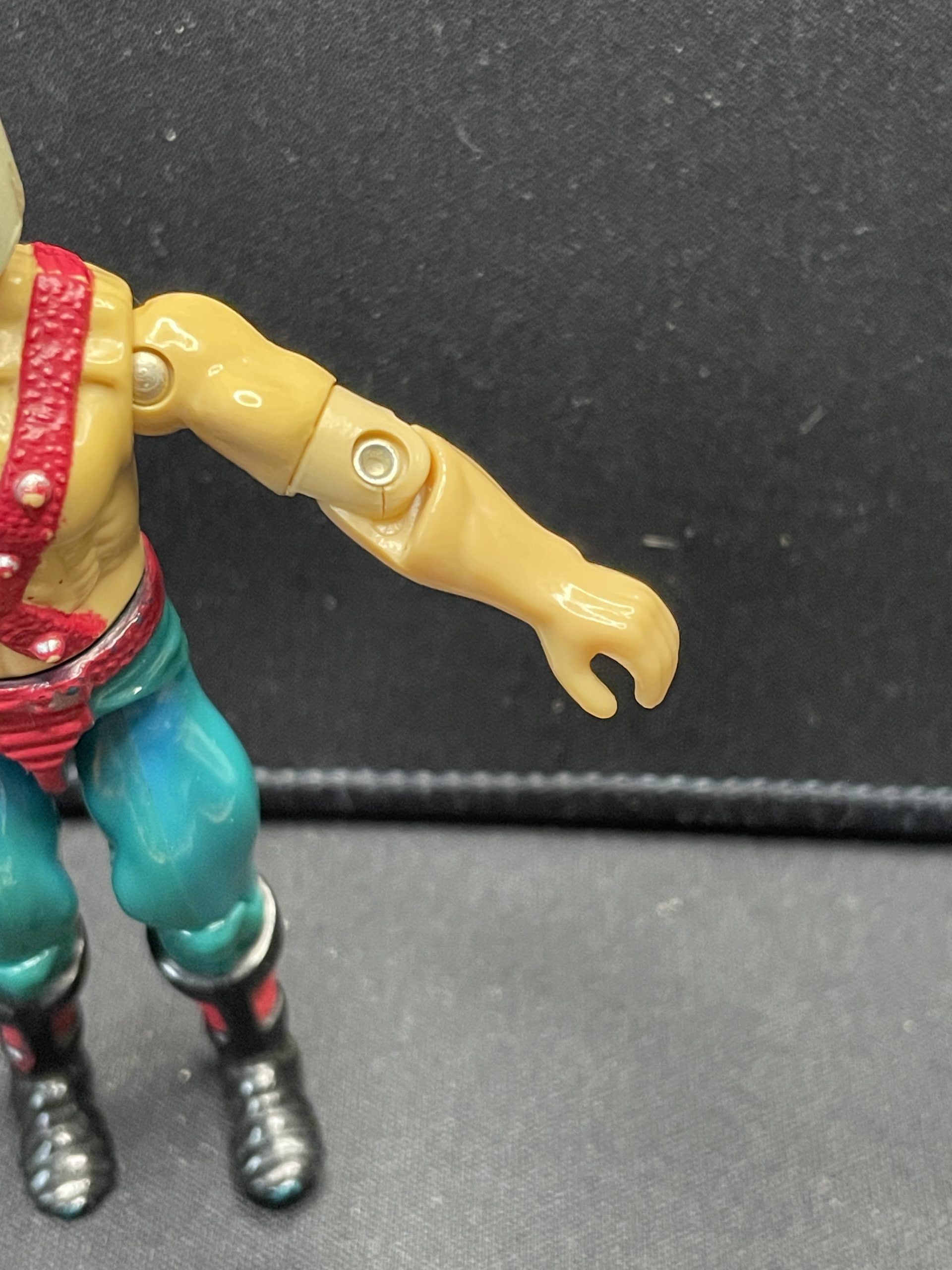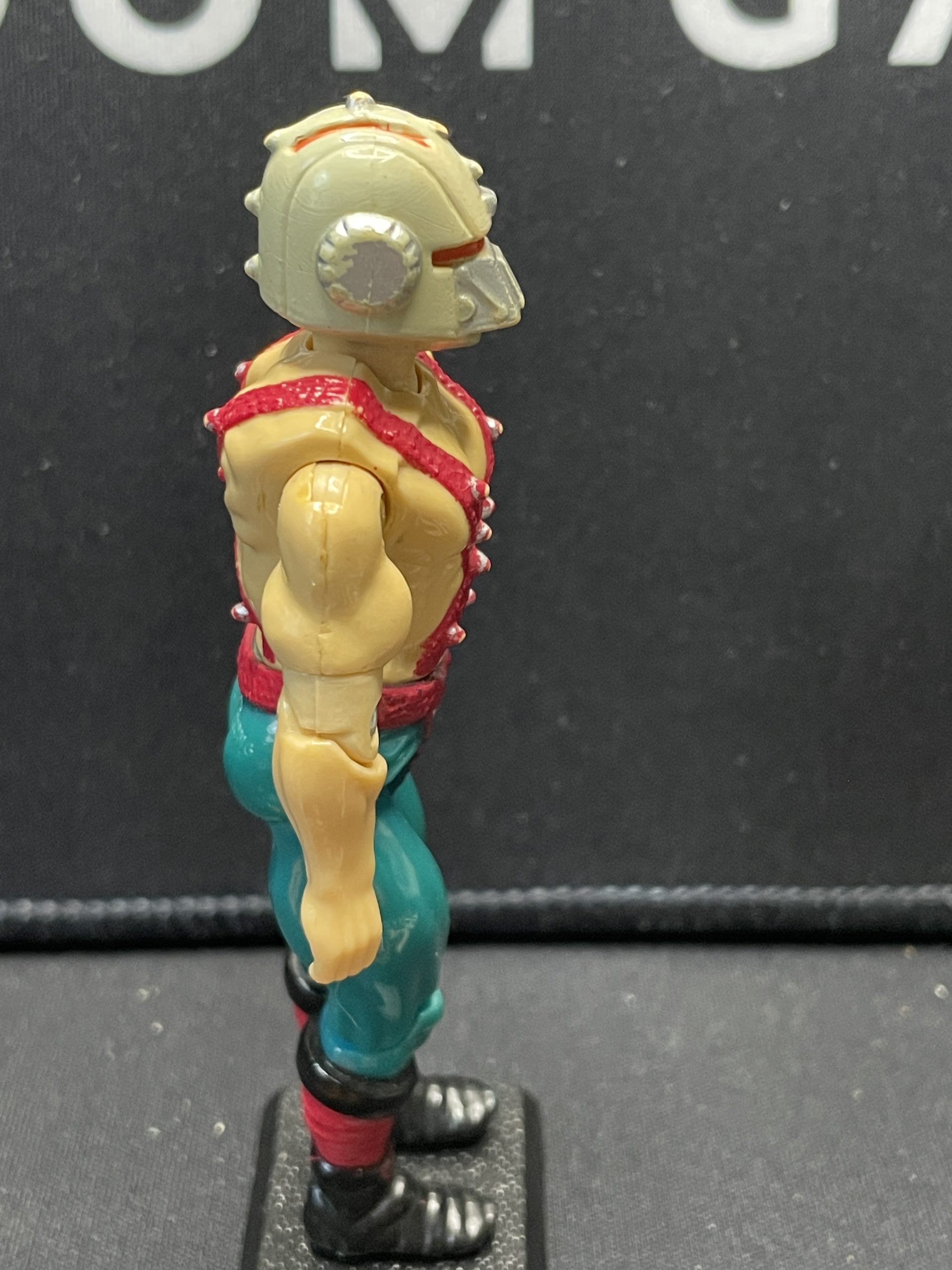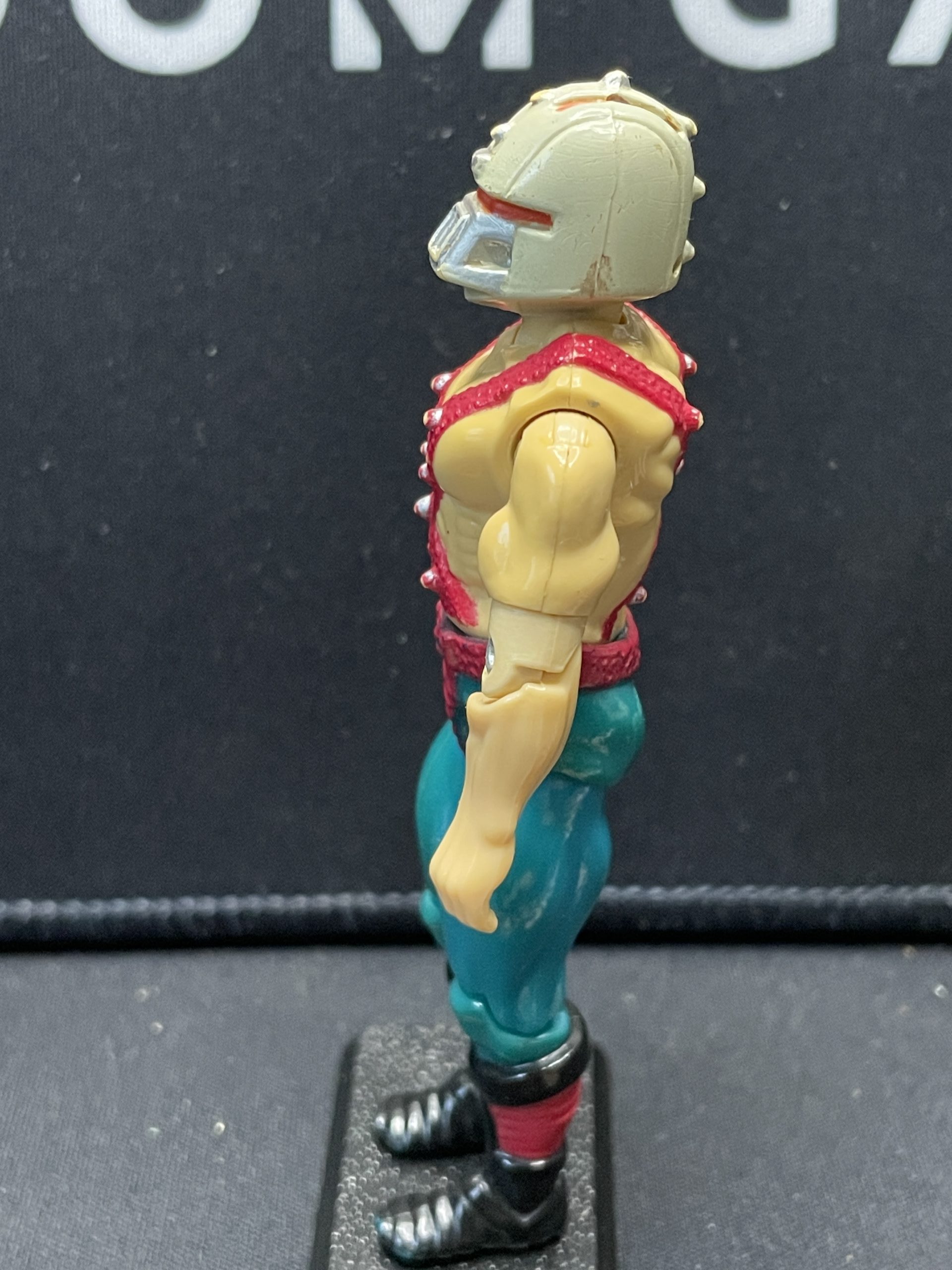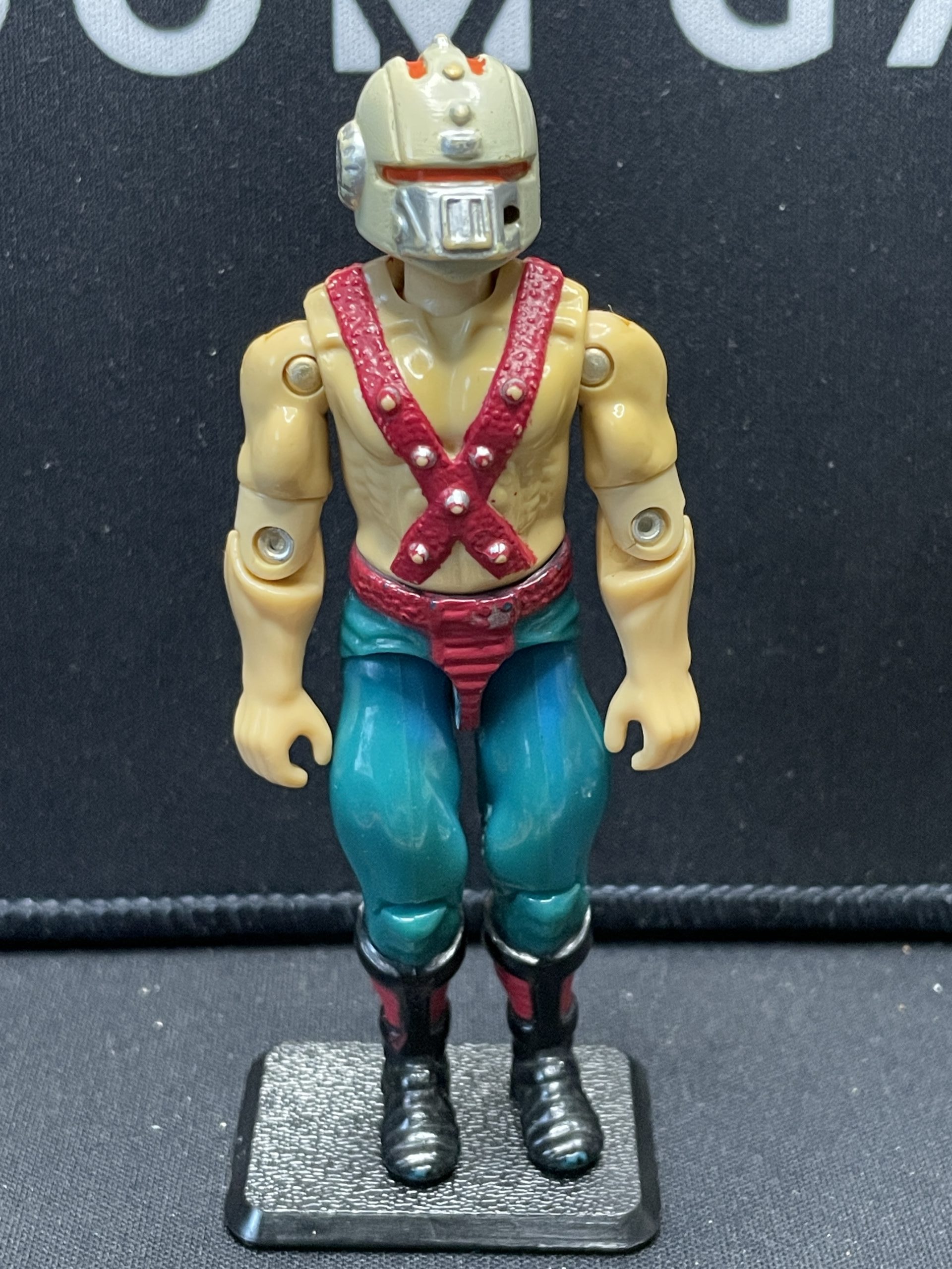 Previously played condition, left elbow joint has a cracks, paint fade and discoloring in legs. New O-ring. Missing punching bag stand, 1 glove and helmet attachment.